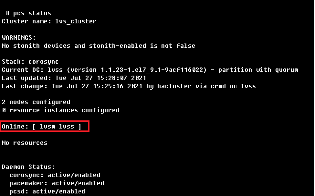 | # pcs cluster setup --name pdns_cluster pdnsm pdnss # pcs cluster start --all # pcs cluster enable --all # pcs property set stonith-enabled=false |